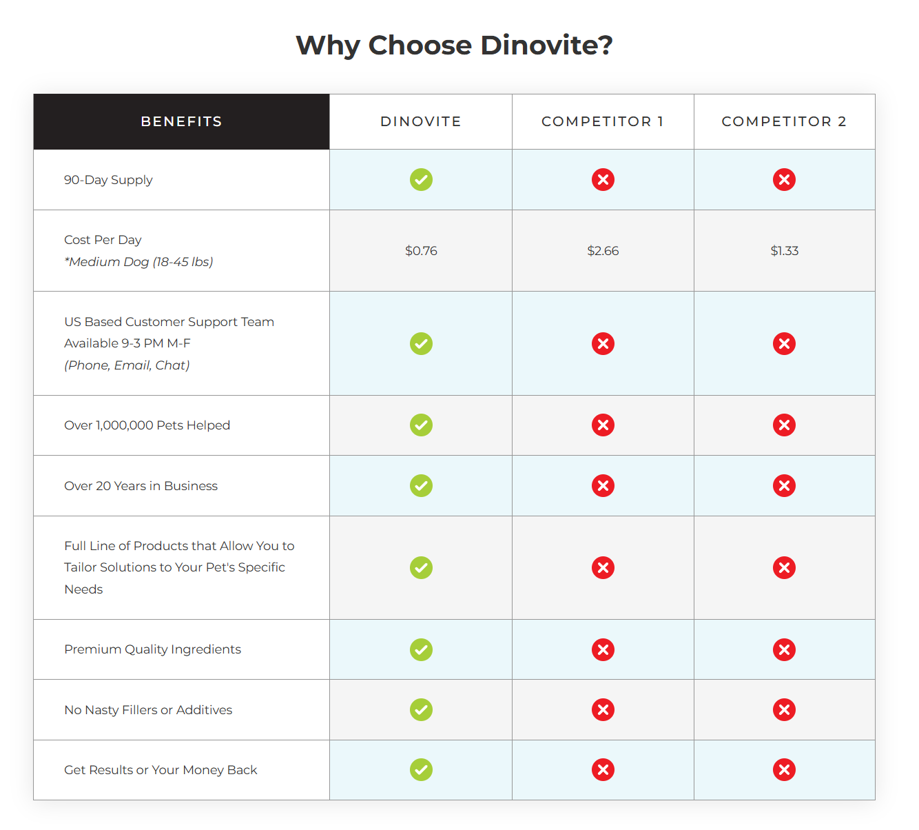 Many pet parents trust Dinovite for its premium-quality ingredients and long-standing reputation. While Dinovite is not a prescription product, it is formulated with care to complement a healthy diet. Always consult your vet to determine what’s best for your dog.
